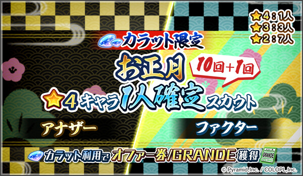 「アナザー」や「ファクター」の★4キャラ1人が確定スカウトできる、「カラット限定 10回+1回スカウト」が開催中です。