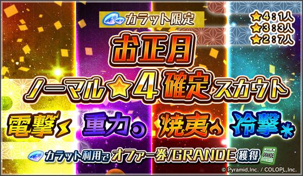 電撃、重力、焼夷、冷撃の各属性のノーマル★4キャラ1人が確定スカウトできる、4種の「カラット限定 10回+1回スカウト」が開催中です。