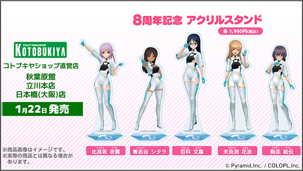 対象のコトブキヤ店舗にて、5種類のアクリルスタンドが販売中!