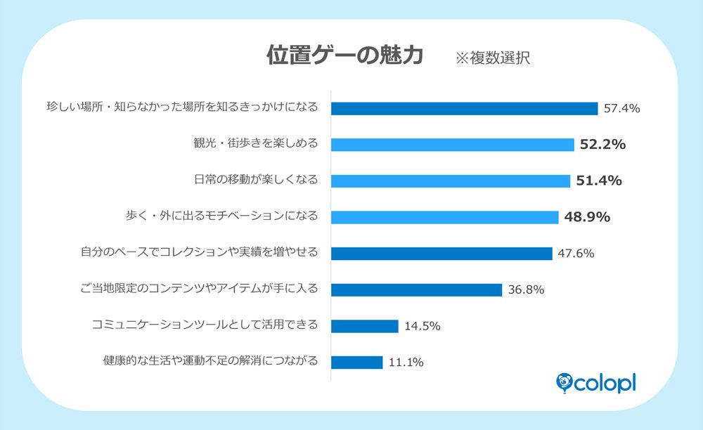 - "位置ゲー"の魅力:「観光・街歩きを楽しめる」52.2%、「日常の移動が楽しくなる」51.4%、「歩くモチベーションになる」48.9%