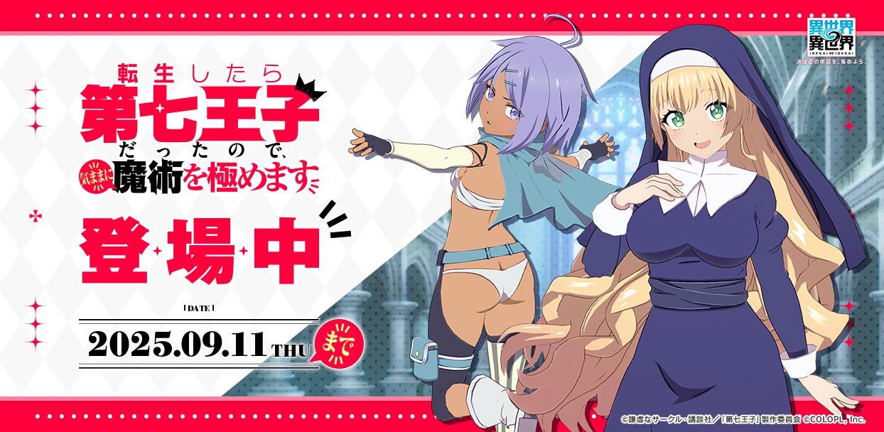 本日2025年9月1日(月)より「3rdシーズン」が開幕し、第1弾として、人気アニメ作品「転生したら第七王子だったので、気ままに魔術を極めます」とキャラクターが本作に登場しております。