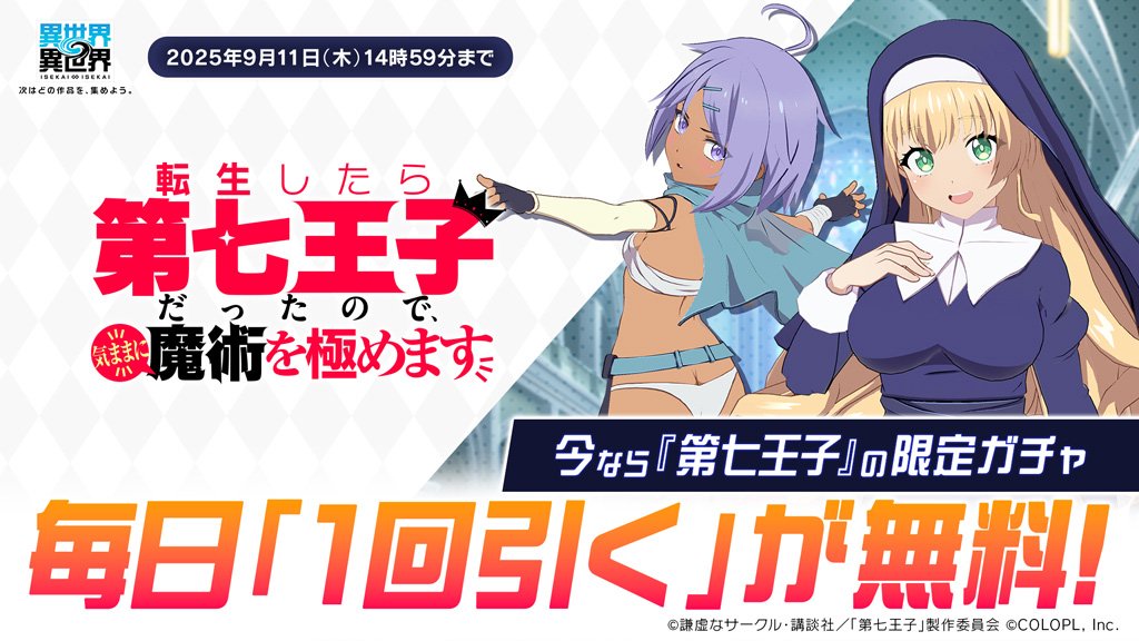 株式会社コロプラ(代表取締役社長 上席執行役員 CEO:宮本貴志、本社:東京都港区、以下「コロプラ」)は、スマートフォン&PCでもっと異世界を楽しむゲーム『異世界∞異世界』(いせかいいせかい)にて、本日2025年9月1日(月)より「3rdシーズン」を開始し、人気アニメ作品「転生したら第七王子だったので、気ままに魔術を極めます」とキャラクターが登場していることをお知らせいたします。