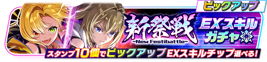 5種類の「EXスキルチップ」が新登場します。また、シャルロット(CV:内田真礼)とマサムネ(CV:悠木碧)の「EXスキルチップ」はピックアップで登場します。★5は「EXスキルチップ」のみ登場いたします。さらに、次のイベントが開催されるまで、本ガチャが1日1回無料になります。スタンプ1個で「セレクト★4メダル」が、スタンプ10個で「新祭戦EXスキルチップメダル」が獲得できるなど、ガチャスタンプカードでもらえる報酬が豪華になっております。