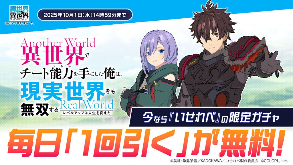 株式会社コロプラ(代表取締役社長 上席執行役員 CEO:宮本貴志、本社:東京都港区、以下「コロプラ」)は、スマートフォン&PCでもっと異世界を楽しむゲーム『異世界∞異世界』(いせかいいせかい)にて、本日2025年9月21日(日)より、人気アニメ作品「異世界でチート能力を手にした俺は、現実世界をも無双する ~レベルアップは人生を変えた~」とキャラクターが登場していることをお知らせいたします。