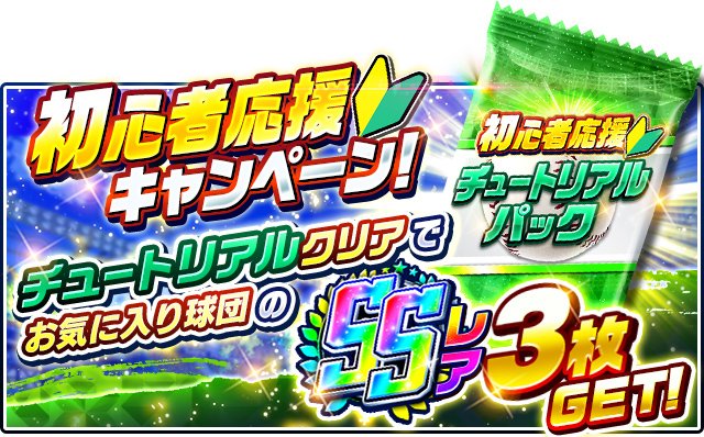チュートリアル完了後にもらえる「チュートリアルパック」から登場する選手が、期間中お気に入り球団のSSレア選手のみになります。