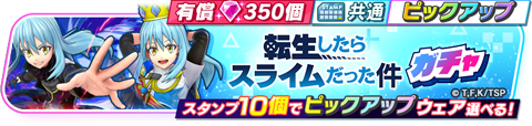リムル(CV:岡咲美保)の2種類のバトルウェアがピックアップで登場し、ウェポンチップやヒーロー専用アクセサリーも登場いたします。また、1日1回無料でまわせるほか、10連ガチャを2回まで有償ジュエル350個でまわすことができます。
