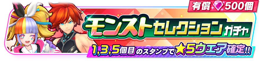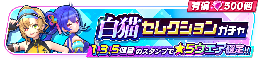 それぞれ★5ウェアが『モンスターストライク』(以下、『モンスト』)の2キャラクターのみ、『白猫プロジェクト NEW WORLD'S』(以下、『白猫』)の2キャラクターのみが登場するガチャの第2弾が開催予定です。本ガチャは有償ジュエル500個限定で5回までまわすことができ、1回目、3回目、5回目のスタンプでは★5ウェアが確定となります。『モンスト』からはジャック・ザ・リッパー(CV:高橋李依)、エクスカリバー(CV:小西克幸)の2人が、『白猫』からはシャルロット(CV:内田真礼)、ノア(CV:水瀬いのり)の2人が登場します。それぞれのキャラクターは限定ウェアも登場します。