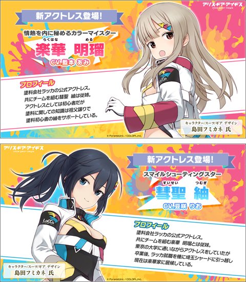 コラボを盛り上げる「アンバサダーアクトレス」として、新たに「楽華 明瑠(CV:藍本 あみ)」と「彗聖 紬(CV:豆咲 りお)」がプレイアブルキャラとして登場しました。