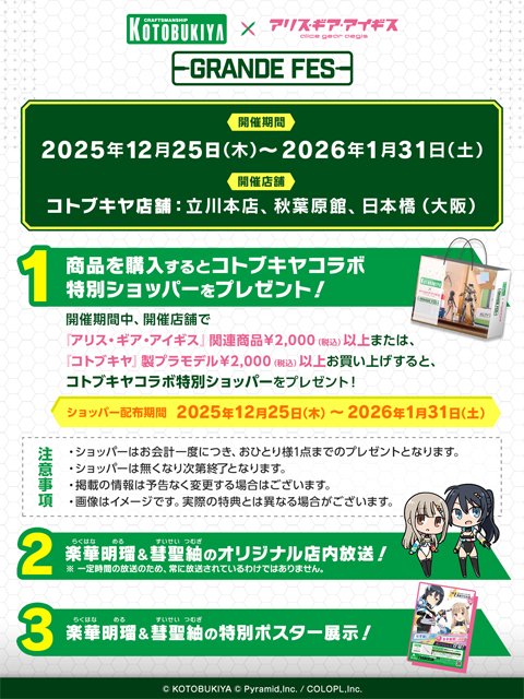現在開催中のコラボ『コトブキヤ(株式会社壽屋)×アリス・ギア・アイギス グランデフェス』にて、「楽華 明瑠」と「彗聖 紬」が登場するオリジナル店内放送の実施が決定しました!他にも下記を実施します。