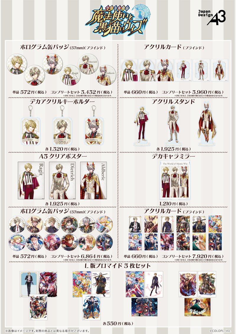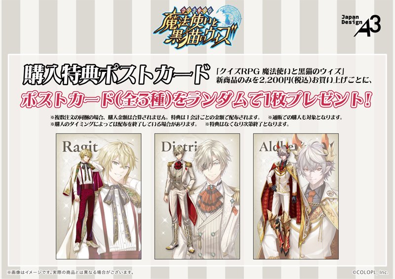一覧に記載のある『黒猫のウィズ』の商品を1会計2,200円(税込)お買い上げごとに、購入特典としてポストカード(全3種)をランダムで1枚プレゼントいたします。