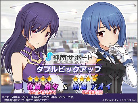 さらに、「在賀 奈々(CV:星ノ谷 しずく)」と「的場 アオイ(CV:岩橋 由佳)」のノーマル★4キャラクターをピックアップしたスカウトも開催中です。