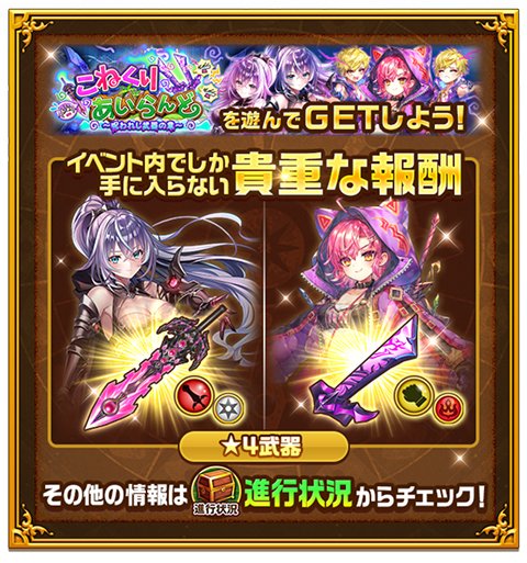 本イベントでは、調査のため島に向かったコルネ(CV:小原好美)、ルグノス(CV:河西健吾)とディアイゼ・ガラティナ(CV:水野朔)が、使うと武器が呪われるルーンの謎を追い、奮闘する物語をお楽しみいただけます。イベントでは2種類の武器が入手できますので、イベントを通じて強化してお楽しみください。