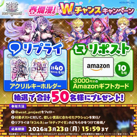 また、『白猫』公式Xではリプライやリポストでご参加いただけるキャンペーンを実施しております。対象のポストに対して、リプライしていただいた方の中から抽選で各20名様にアクリルキーホルダー(全2種)を、リポストしていただいた方の中から抽選で10名様にギフトカードを、プレゼントいたします。