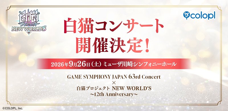 日頃より応援してくださっている皆さまのおかげで、『白猫』は2026年7月14日(火)に12周年を迎えます。12周年記念コンサートを、アイムビレッジが主催する「Game Symphony Japan」第63回公演として、2026年9月26日(土)にミューザ川崎シンフォニーホールにて開催することが決定いたしました。詳細は株式会社アイムビレッジ公式X(@AimVil_MusicDiv)や『白猫』公式X(@wcat_project )などでお知らせいたします。