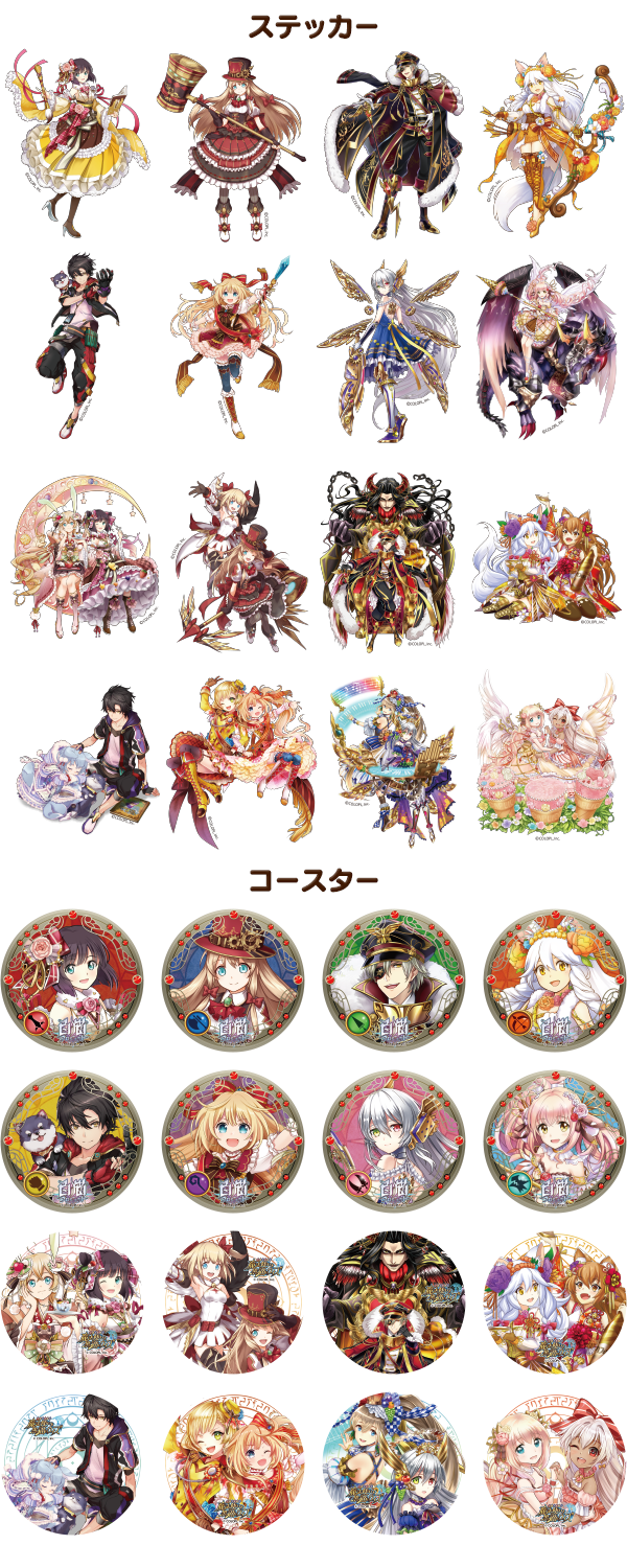 6/10(金)より、ステッカーとコースターを白猫黒猫各8種類追加致します。 白猫全8種類(アリエッタ/キワム/アルティミシア/ディートリヒ/ユッカ/ミコト/ルシエラ/アイ) 黒猫全8種類(アリエッタ&シャルロット/キワム&コヨミ/アルティミシア&コリン/ディートリヒ&ヴィルフリート/ユッカ&マール/ミコト&ツキミ/ルシエラ&ミレイユ/アイ&テレーゼ) この機会にぜひご来場くださいませ。